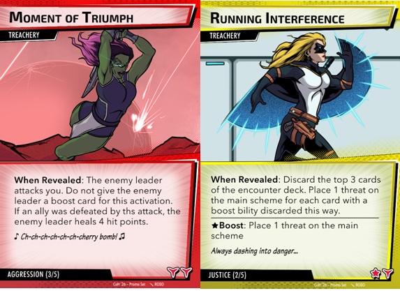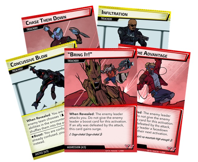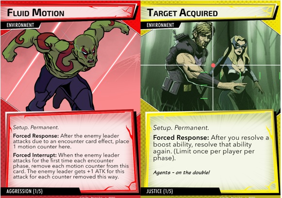 Keep in mind, these can also be used with any Marvel Champions villain, but they include wording like “enemy leader,” etc., from Civil War. So now you can play against an Aggressive Rhino, or maybe a Leadership Klaw who tries to get the band back together (sound pun intended). Each aspect comes with 4 cards that are shuffled into the encounter deck to help synergize the deck. Cards are typically mirrored off player cards (yes, yes, I know Target Acquired isn’t Justice, but the art made it happen).