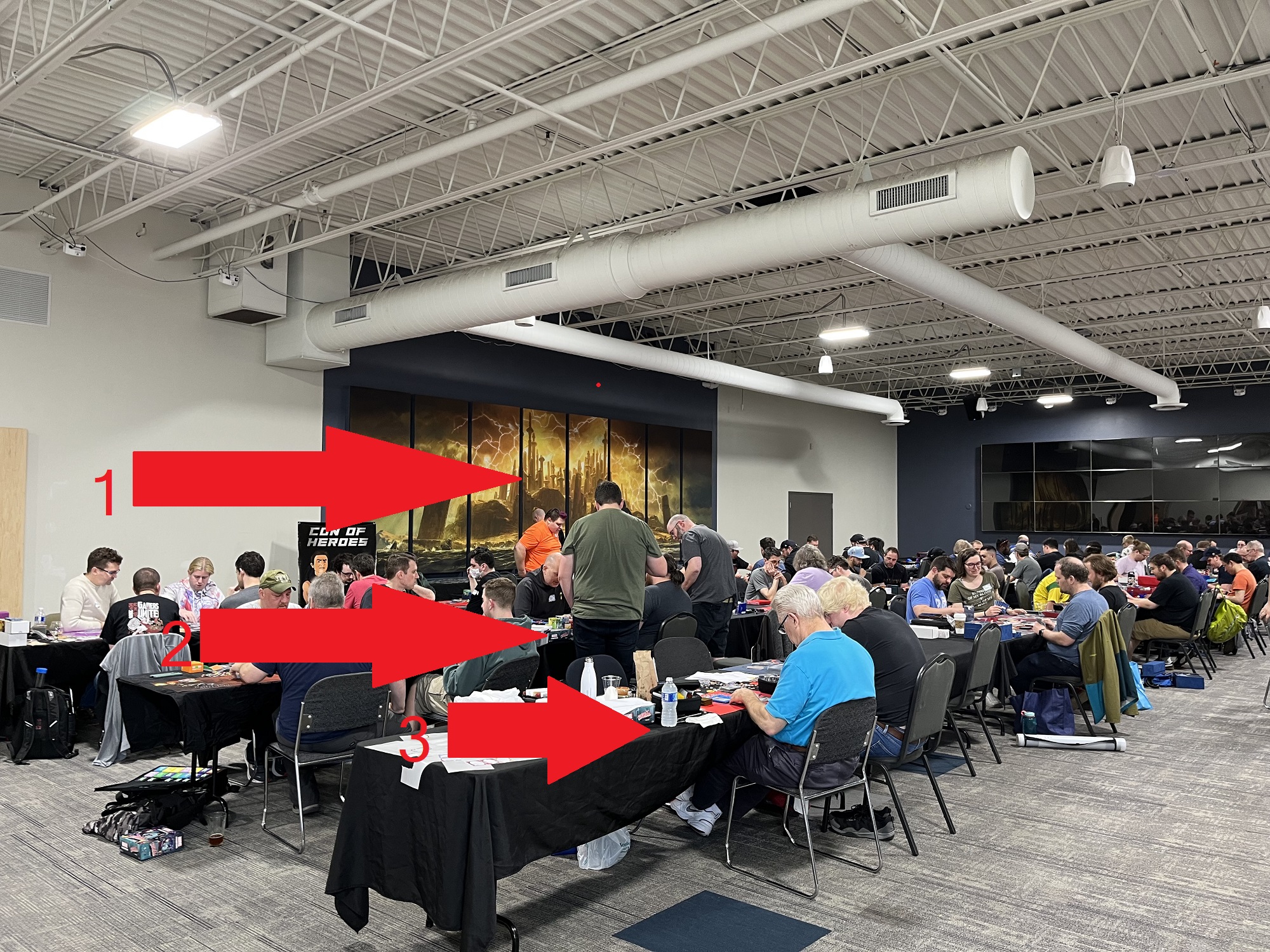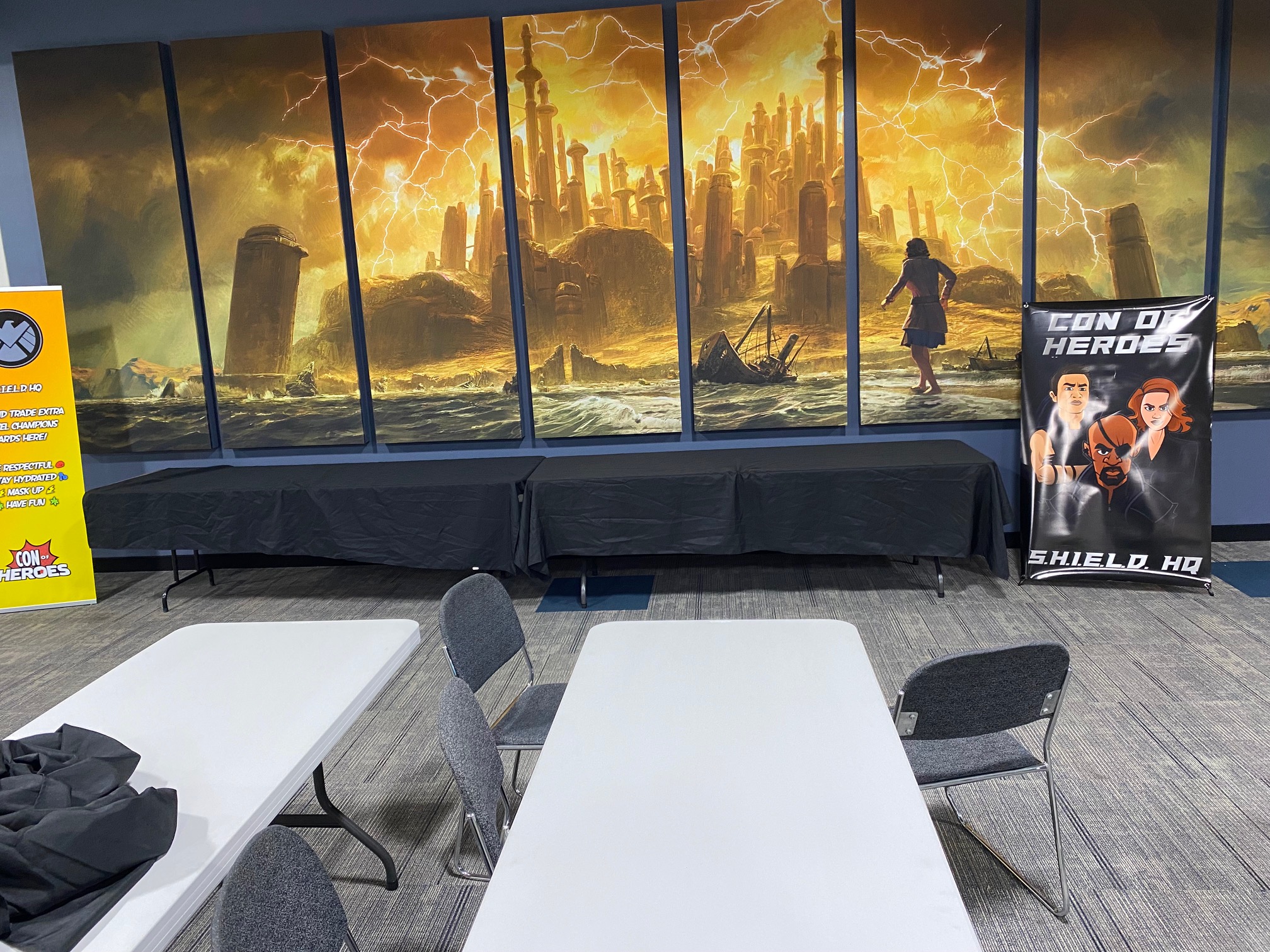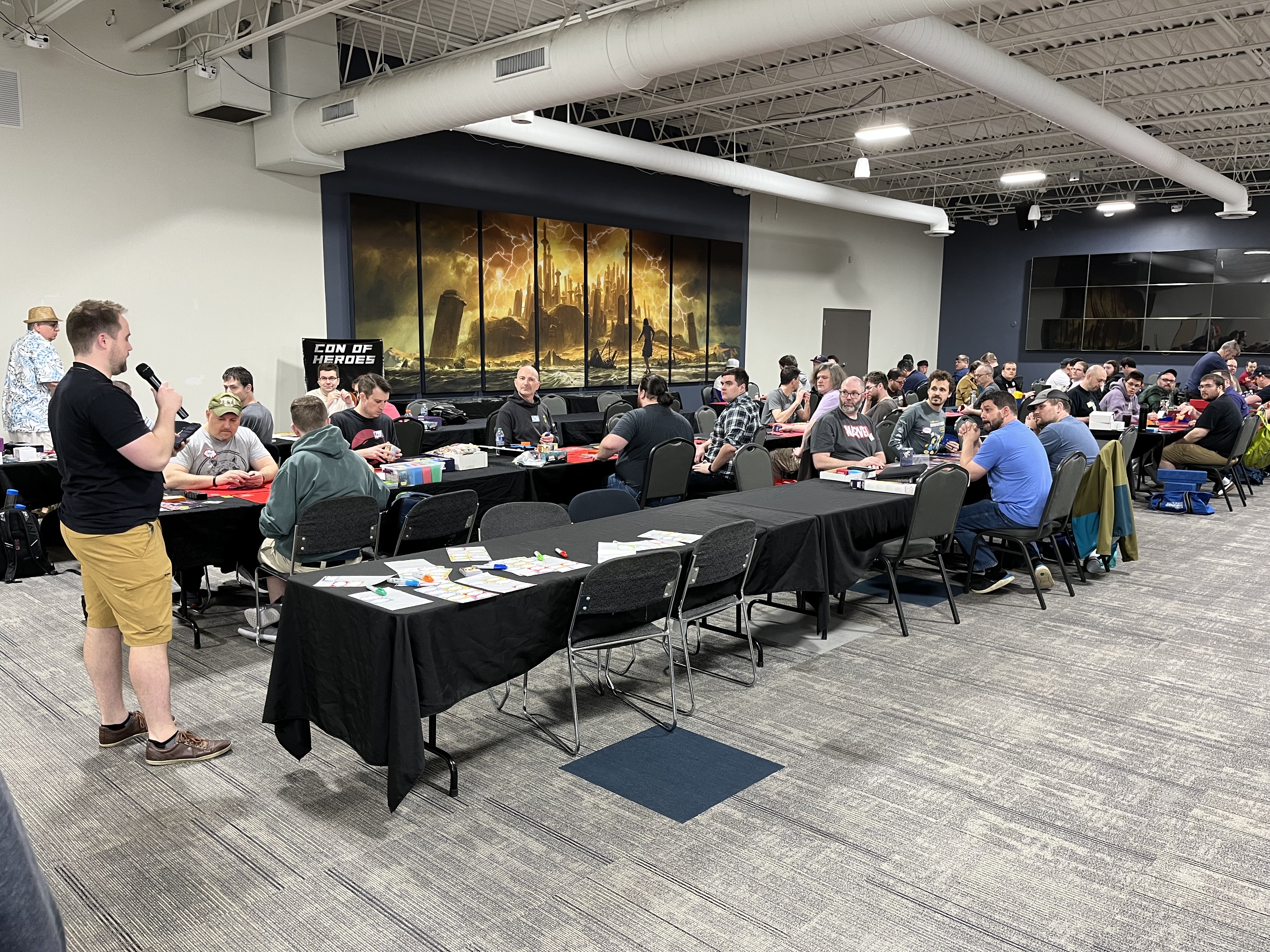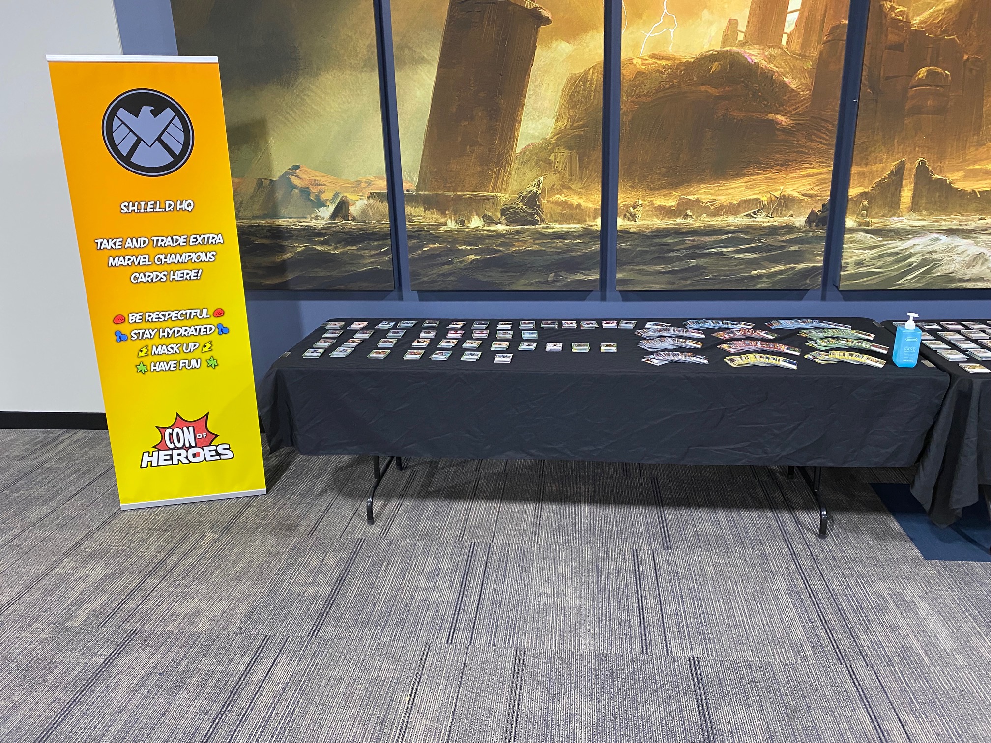 It’s time for another Con of Heroes! Here’s what early Thursday setup looks like at the Gamezenter, and the new banner is on display at the Doubletree hotel.