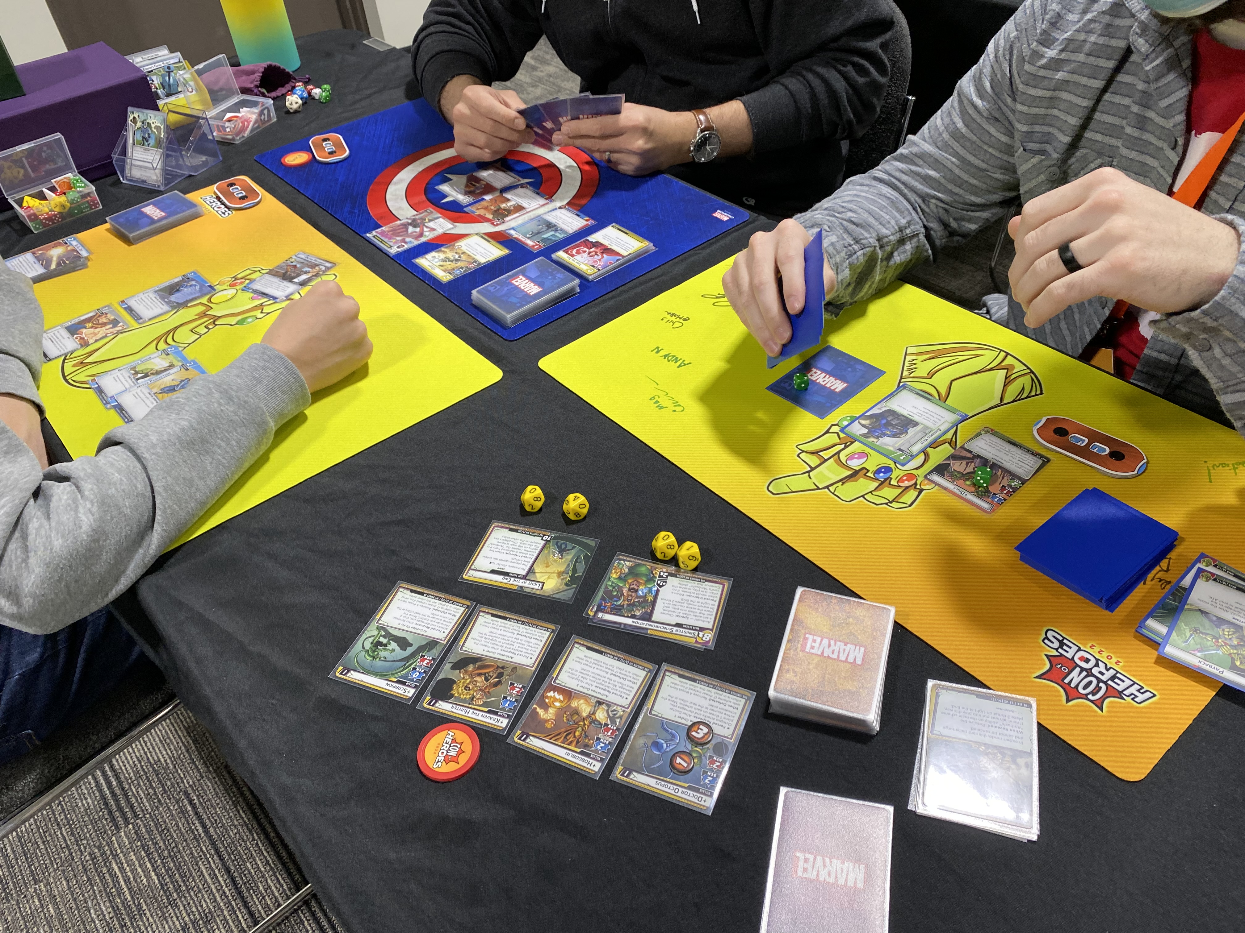 After some cooldown time and some raffles prize callings, we moved on to the Triple Threat Multiverse (multi-table) event. Tables chose between Crossbones and Taskmaster with a twist: three floating super-minion-villain versions of Rhino, Klaw, and Ultron moved around the table within set groups.