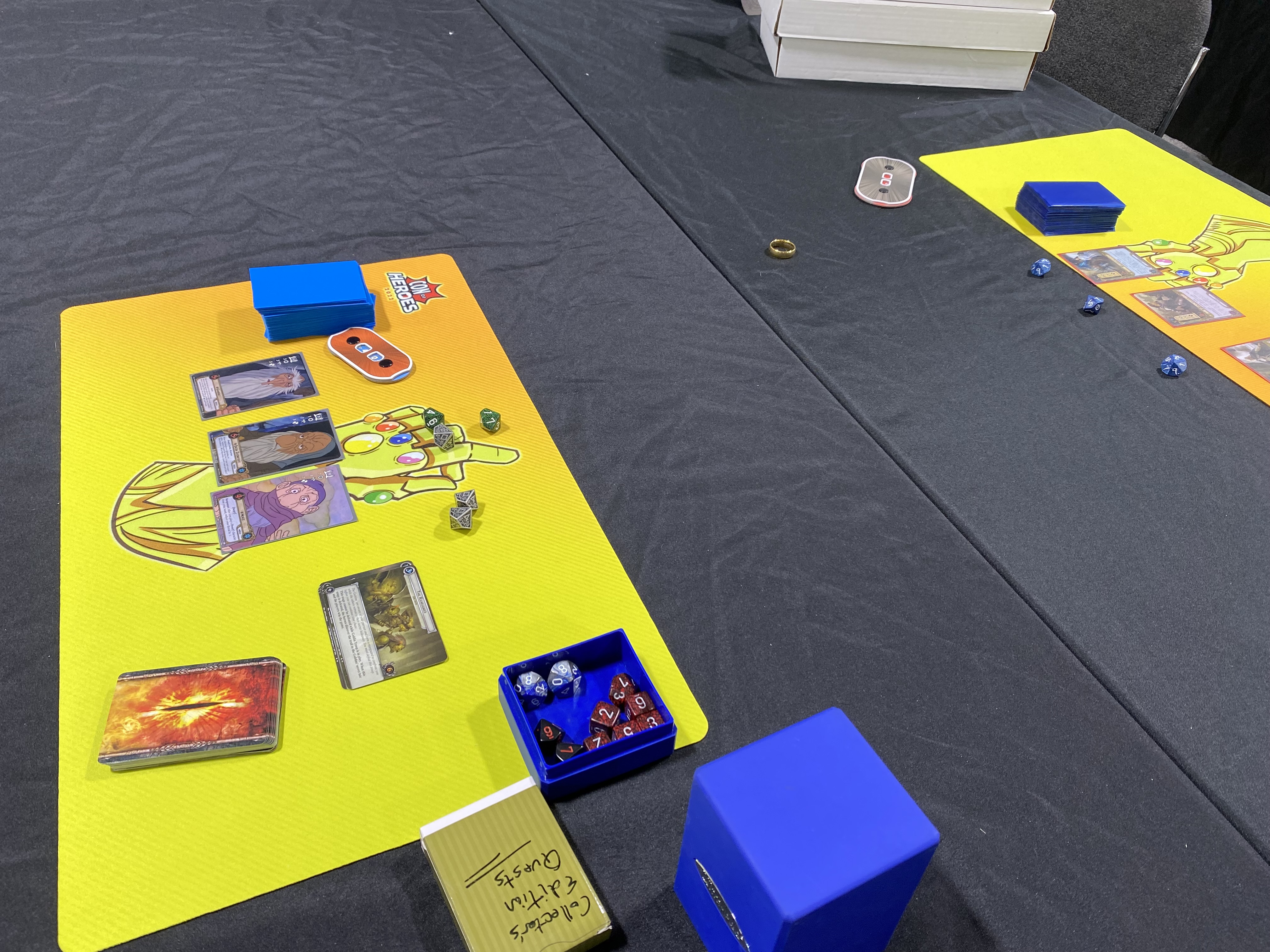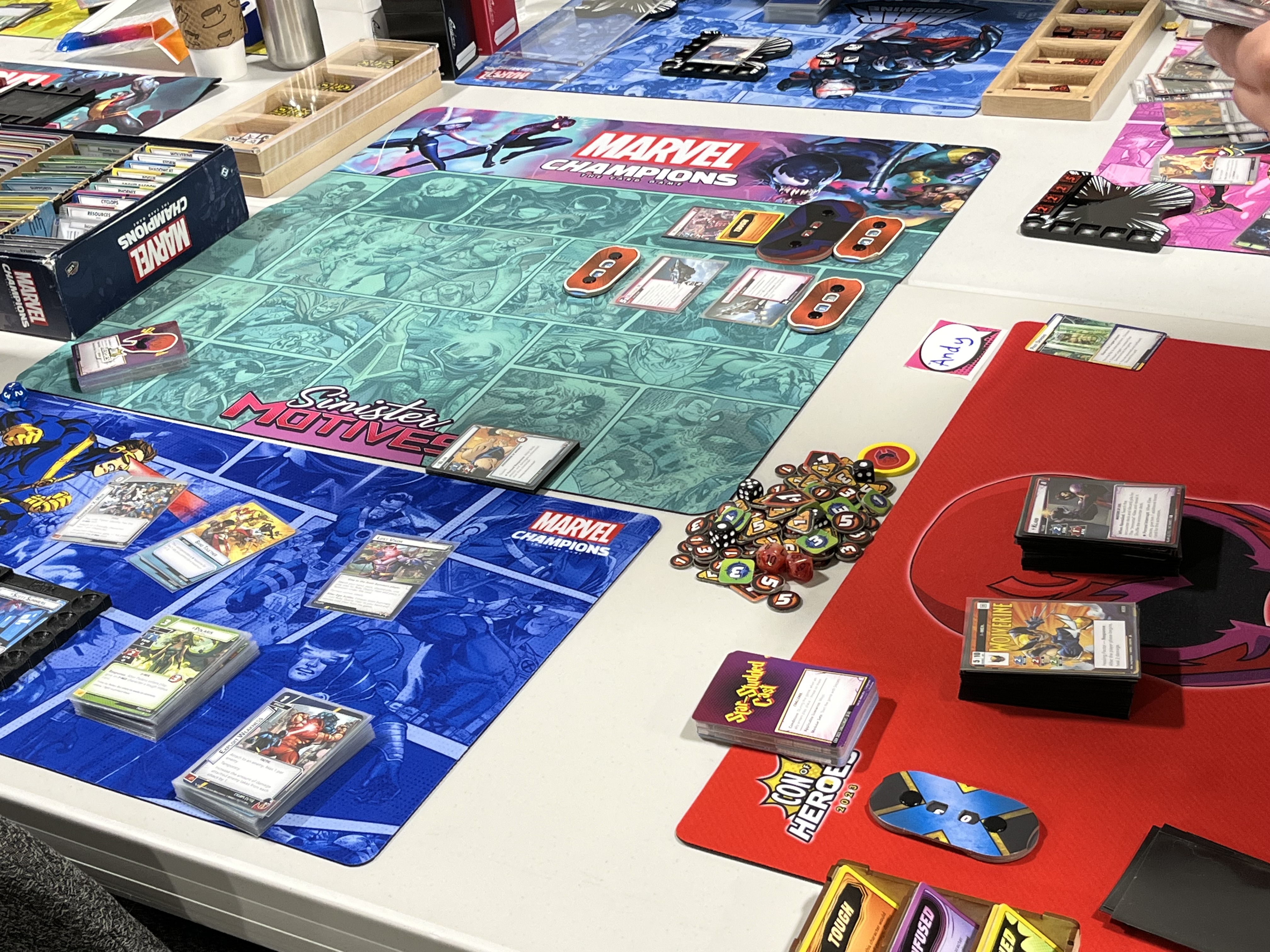 At 4PM we started setting up for our first “epic multiplayer” Con of Heroes event. For those of you who haven’t played epic multiplayer before; Fantasy Flight Games created “epic” (giant) multiplayer scenarios for multiple groups to play together. Nothing official was created for Marvel Champions at the time of Con of Heroes 2023, so we answered the call! All three rows will be taking on Kang in Multiverse Meltdown.