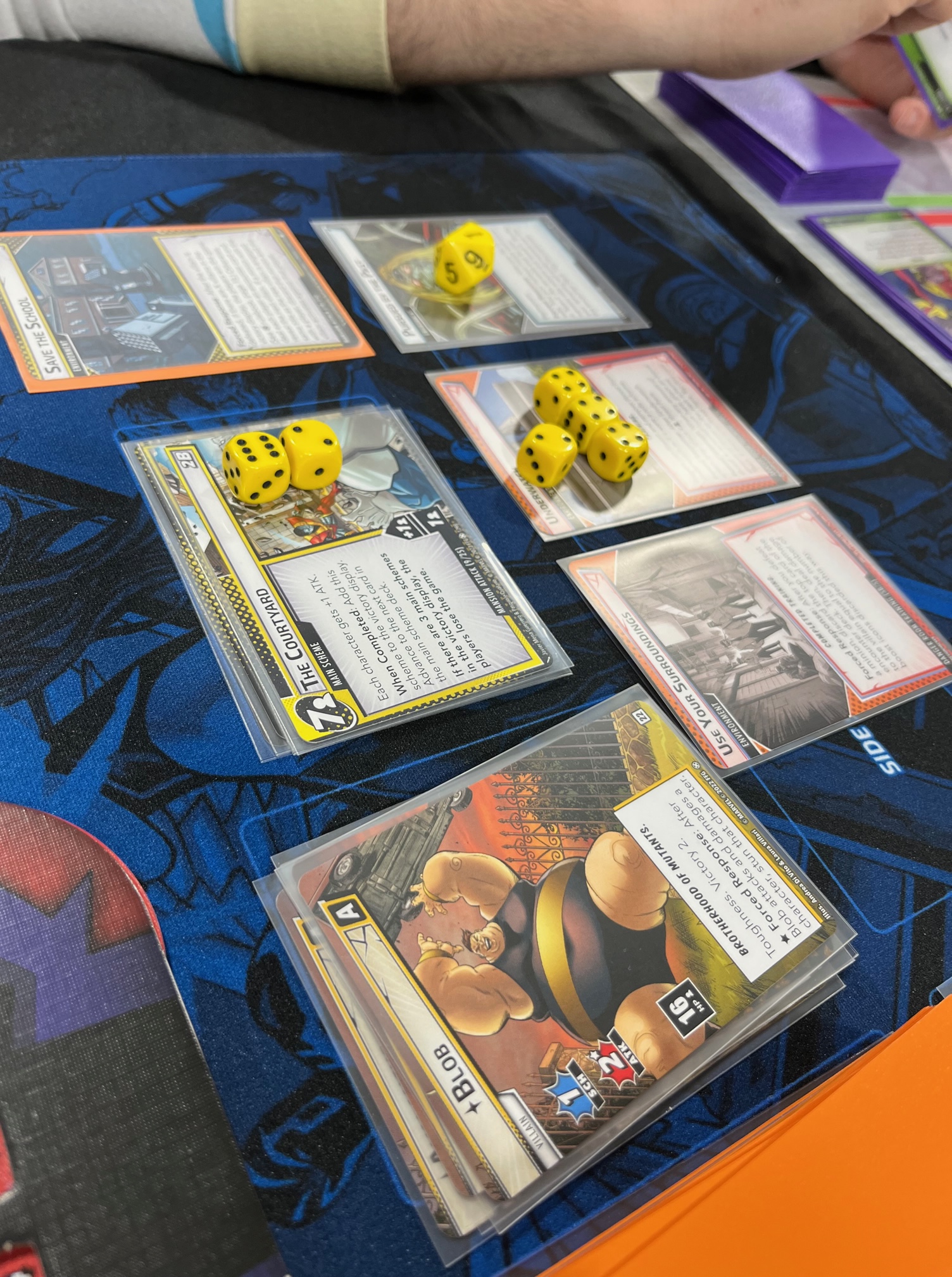 Alongside our featuring of the NeXt Evolution box, our playmat this year is Juggernaut/Mister Sinister-themed (see the shadow?), from our resident artist Dawn Bright!