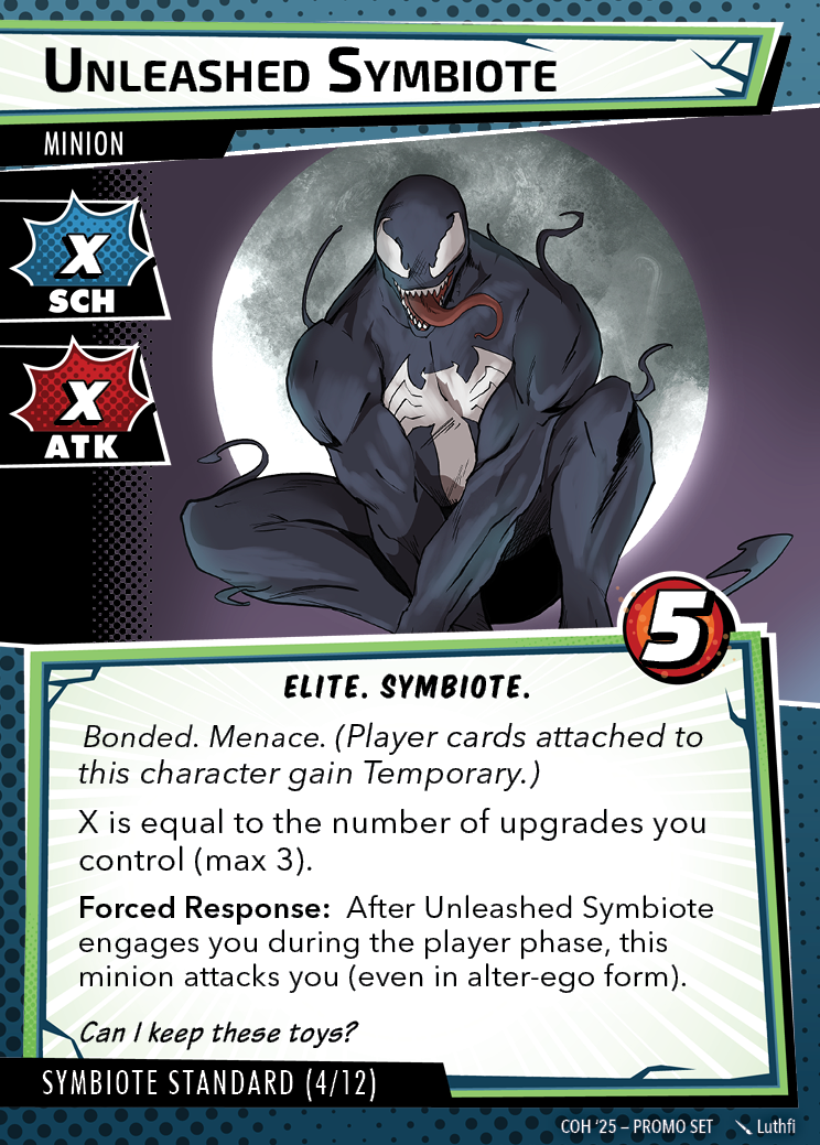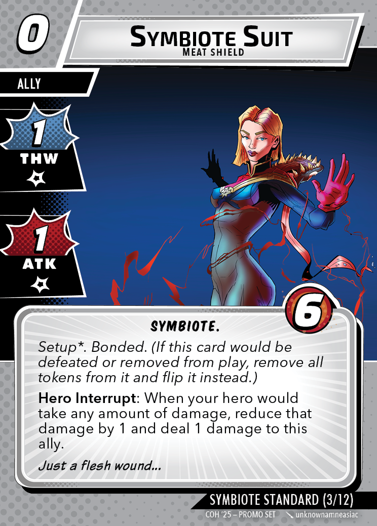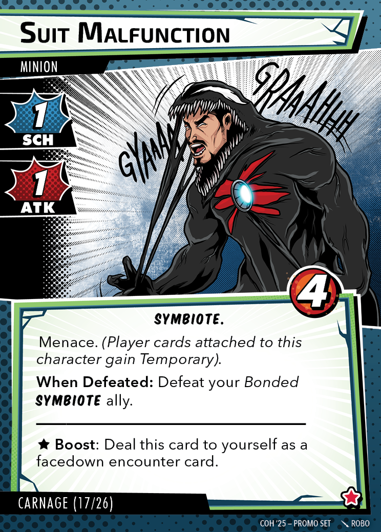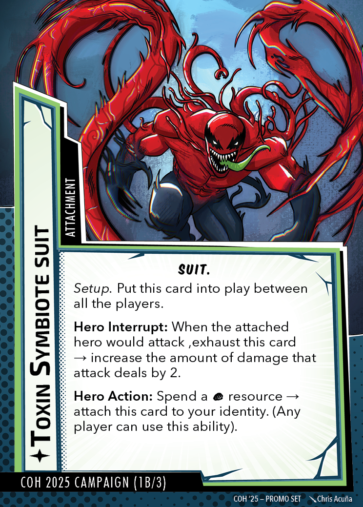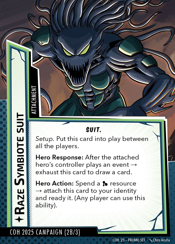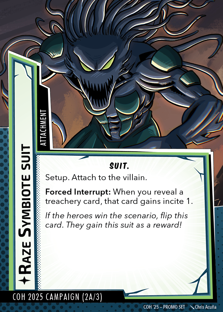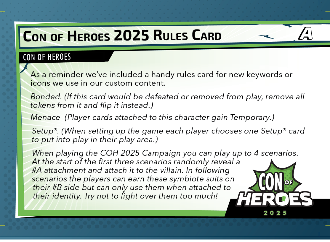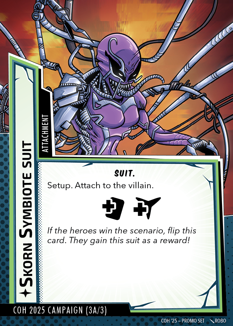 The Con of Heroes 2025 Campaign consists of any four scenarios of your choosing. The first three use double-sided symbiote cards as both challenges and rewards. Randomly select a symbiote upgrade for the first three scenarios, and gain the flipped benefit side as a reward for defeating them.
