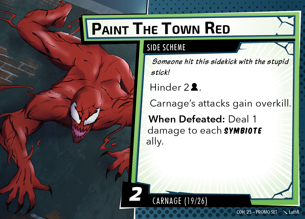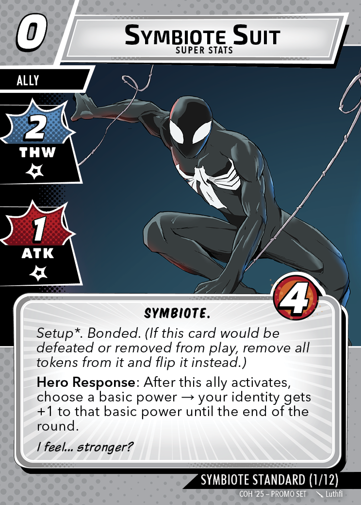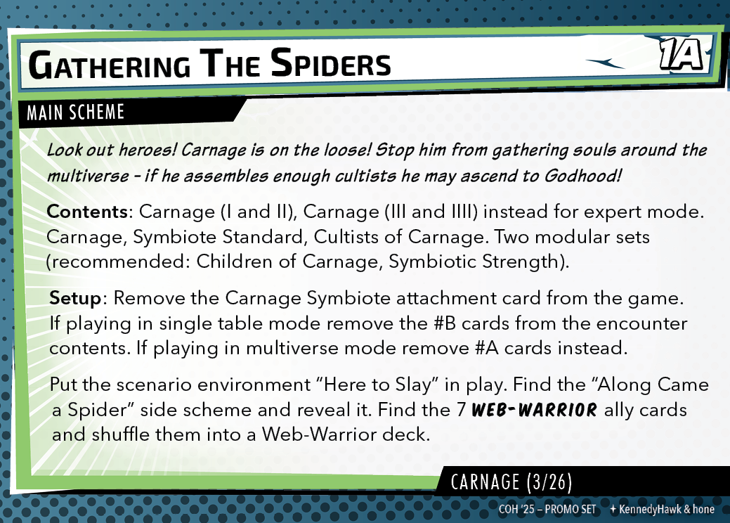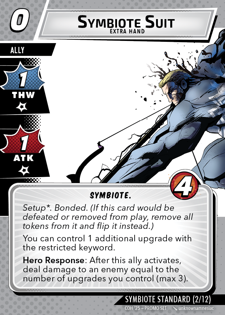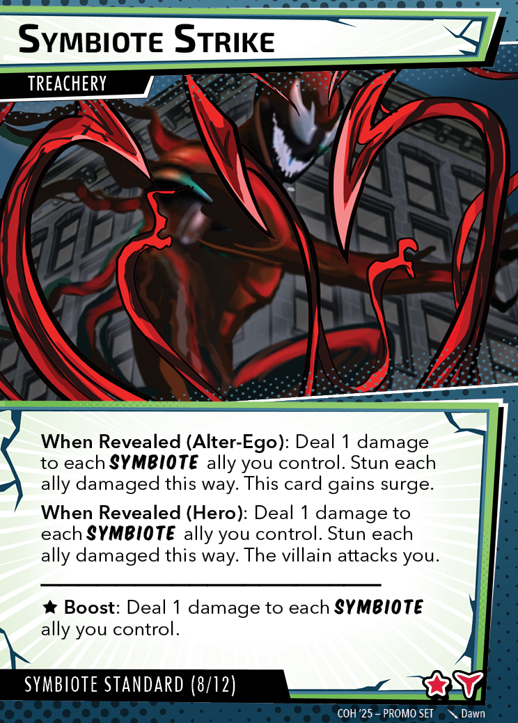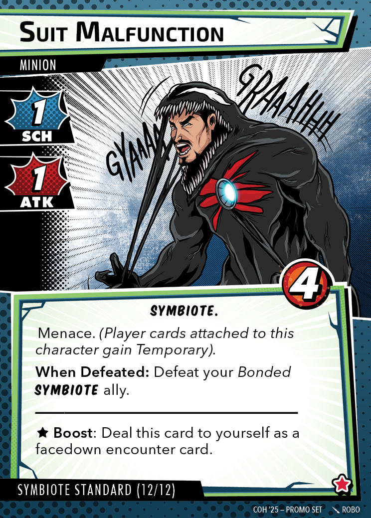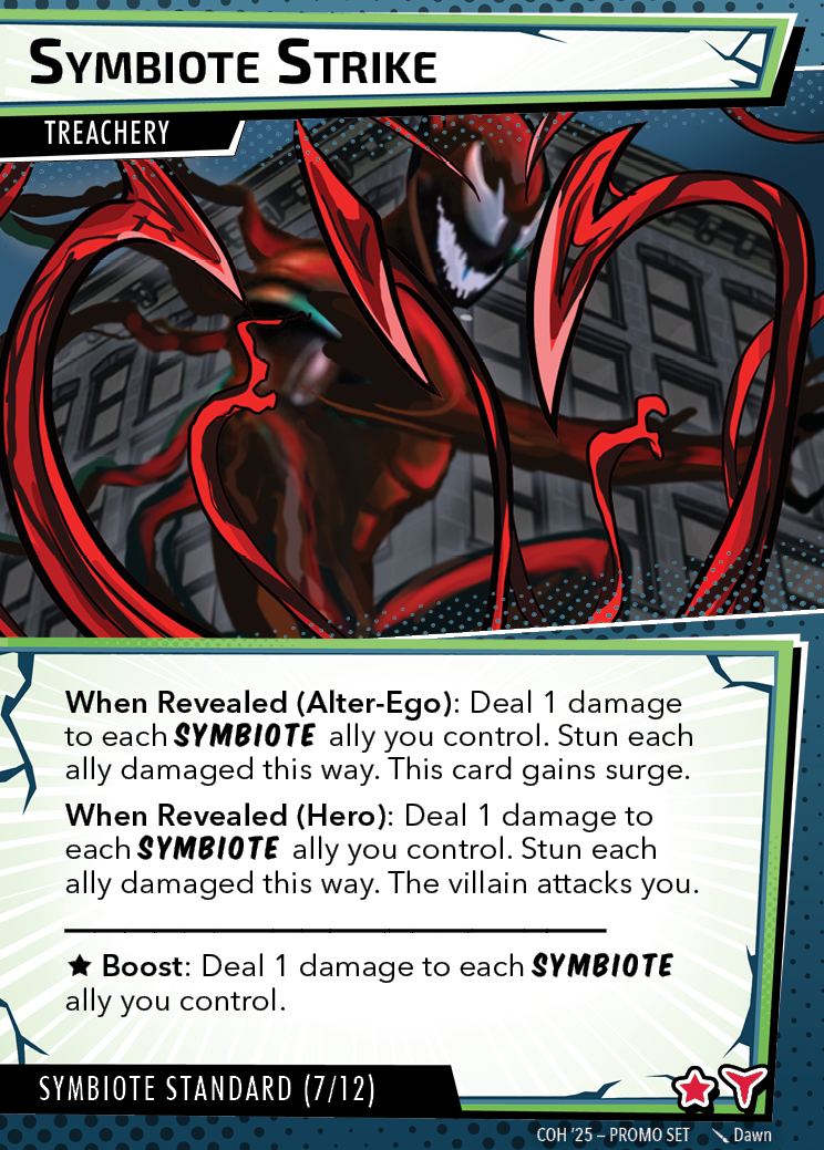 The Con of Heroes 2025 Campaign consists of any four scenarios of your choosing. The first three use double-sided symbiote cards as both challenges and rewards. Randomly select a symbiote upgrade for the first three scenarios, and gain the flipped benefit side as a reward for defeating them.