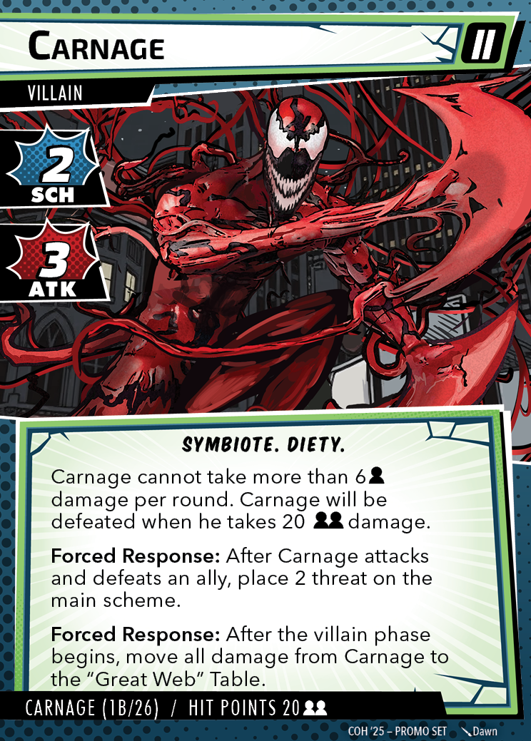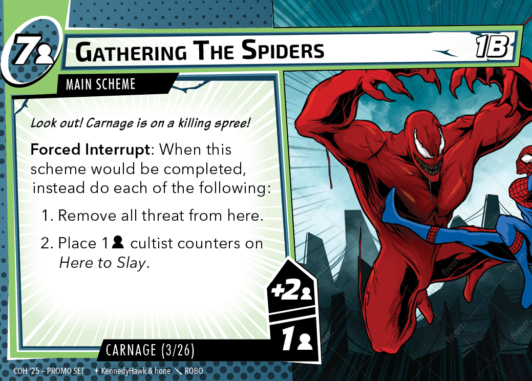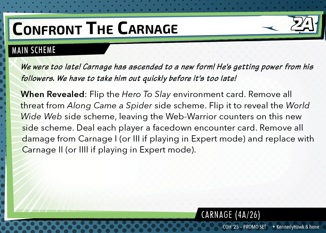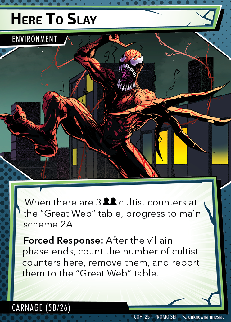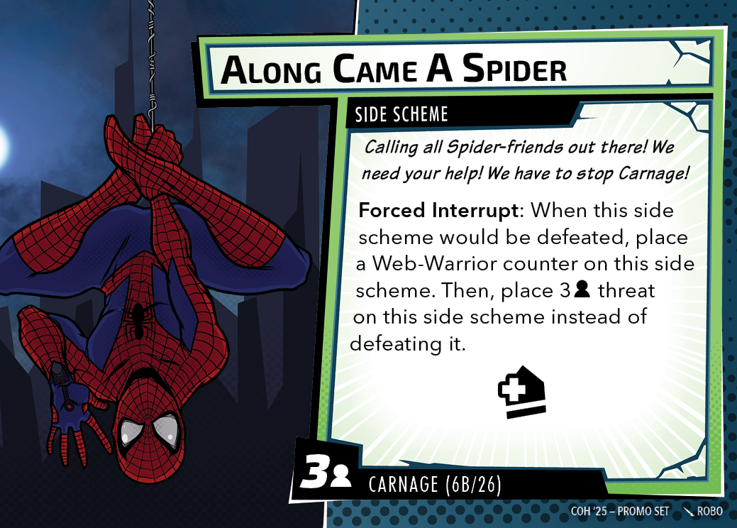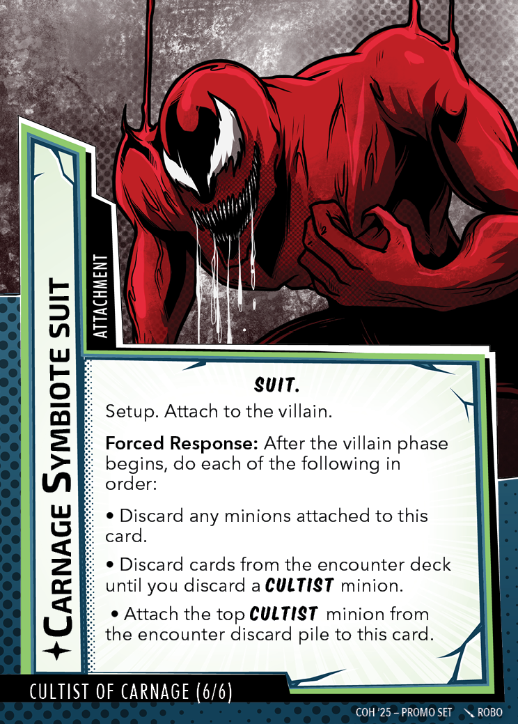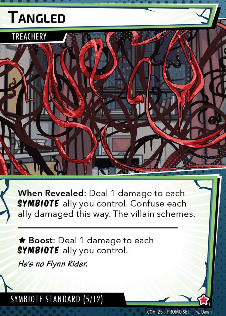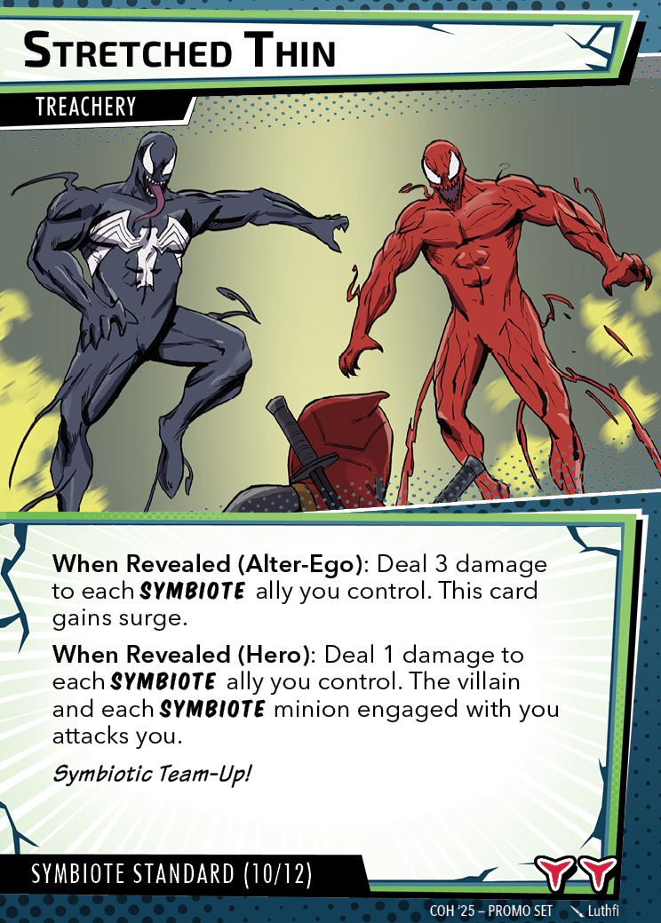 The Con of Heroes 2025 Campaign consists of any four scenarios of your choosing. The first three use double-sided symbiote cards as both challenges and rewards. Randomly select a symbiote upgrade for the first three scenarios, and gain the flipped benefit side as a reward for defeating them.