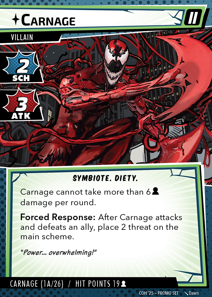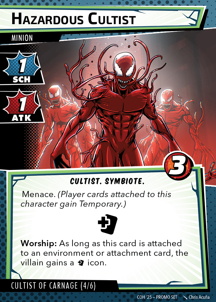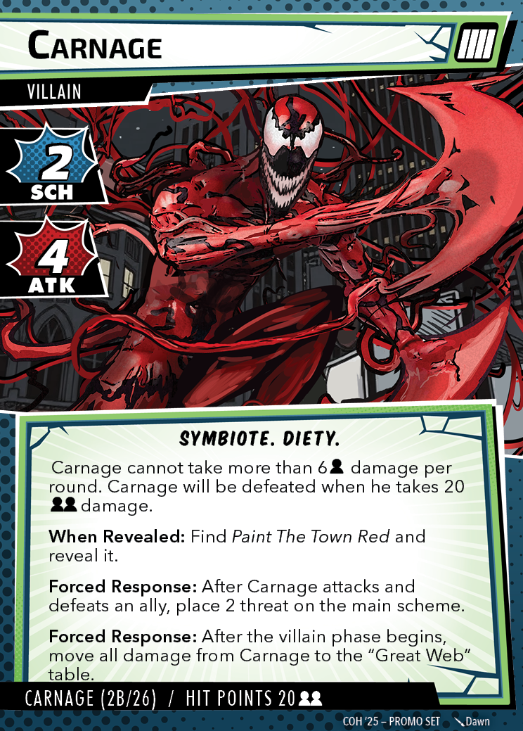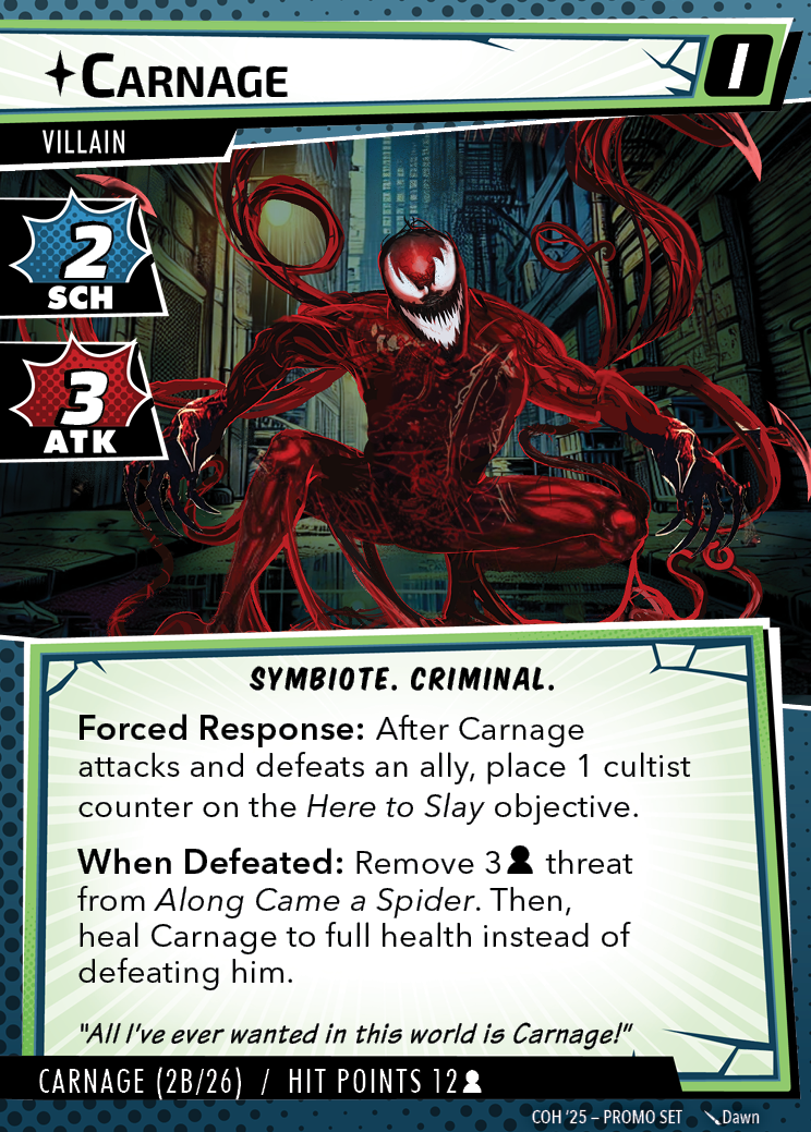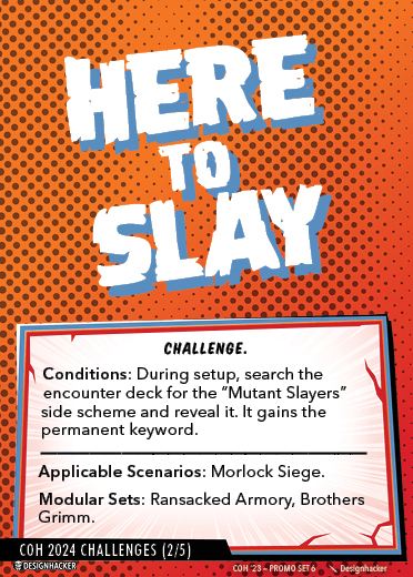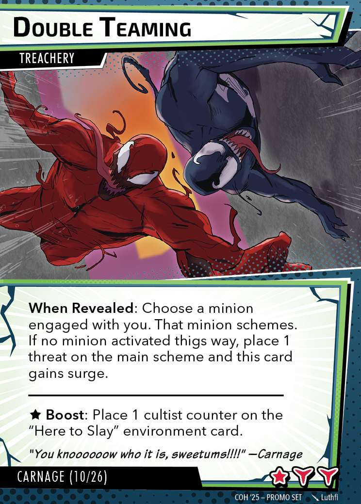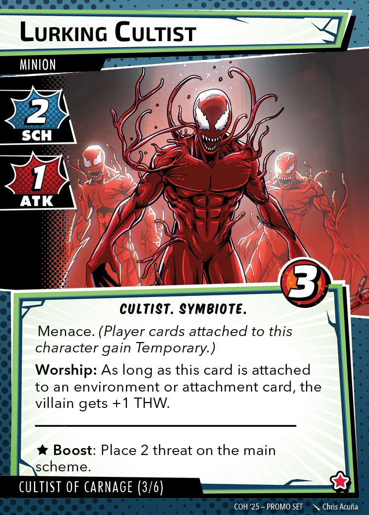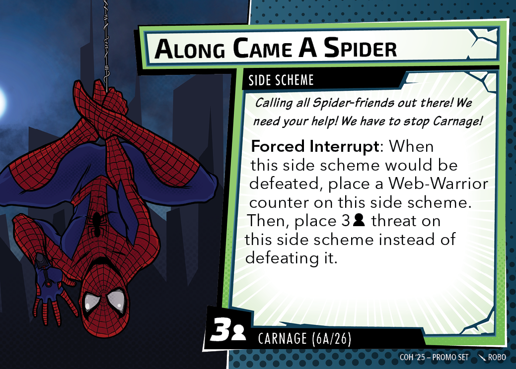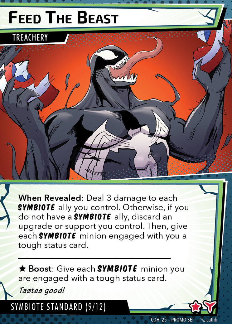 The Con of Heroes 2025 Campaign consists of any four scenarios of your choosing. The first three use double-sided symbiote cards as both challenges and rewards. Randomly select a symbiote upgrade for the first three scenarios, and gain the flipped benefit side as a reward for defeating them.