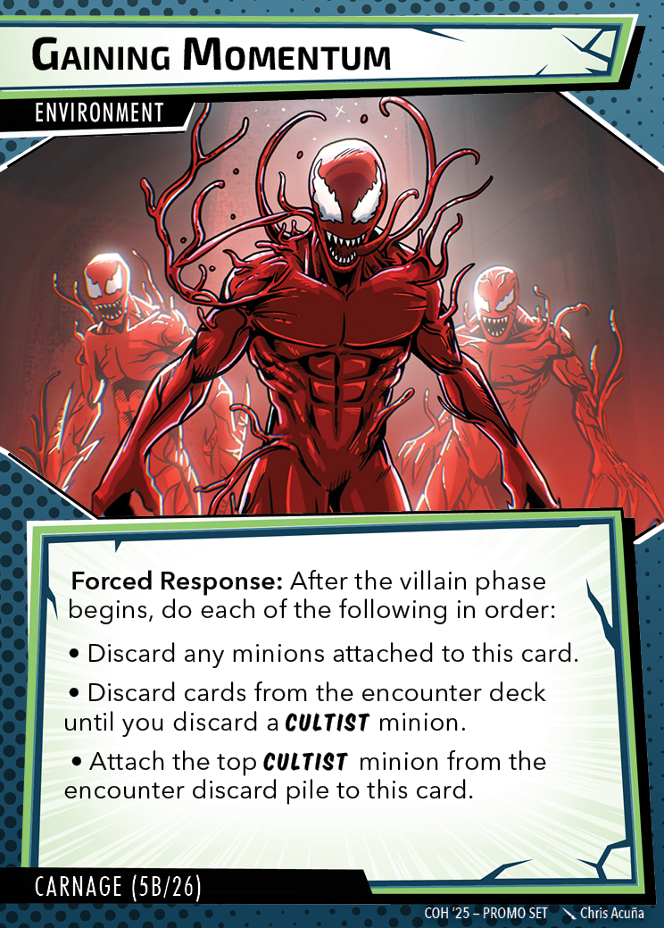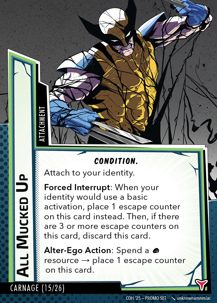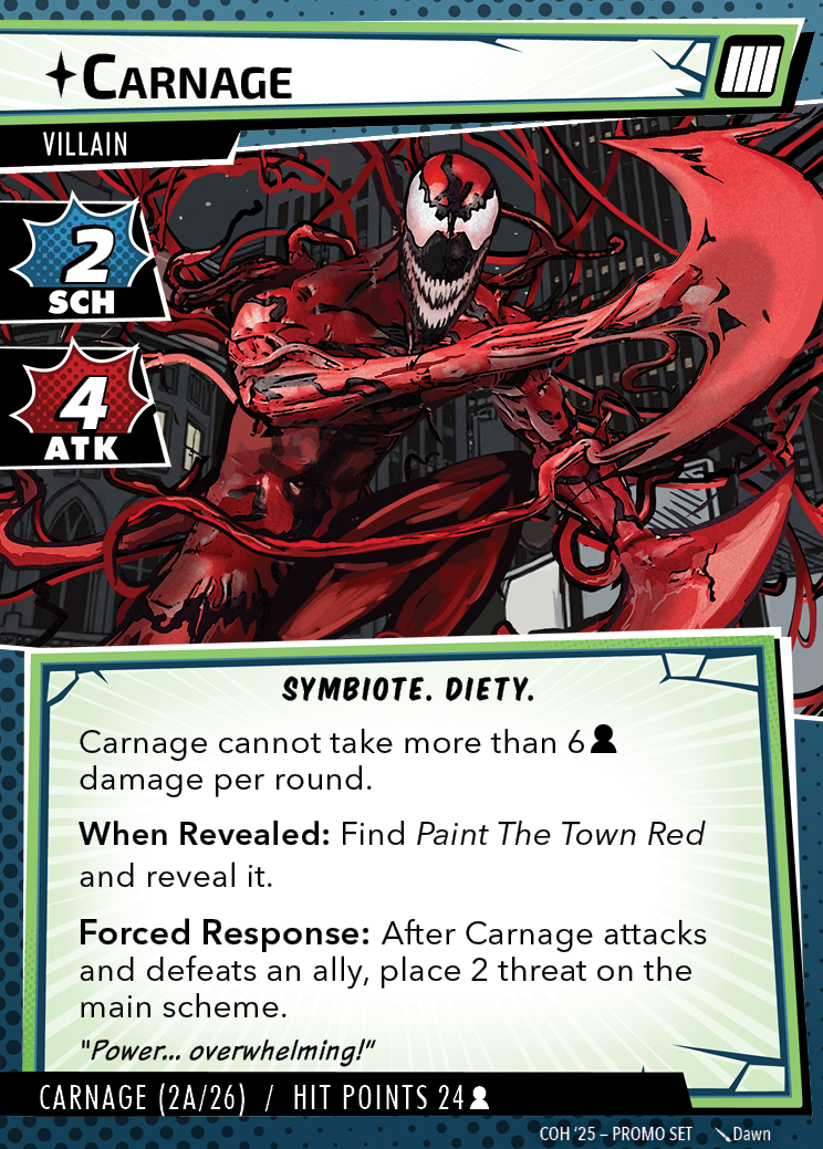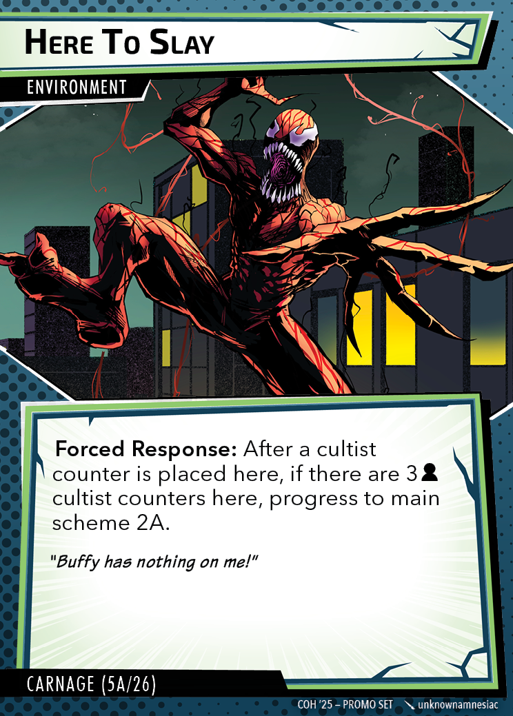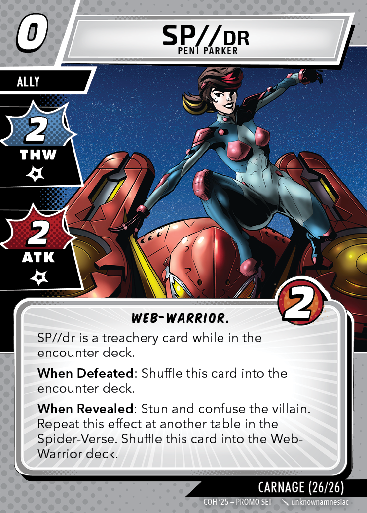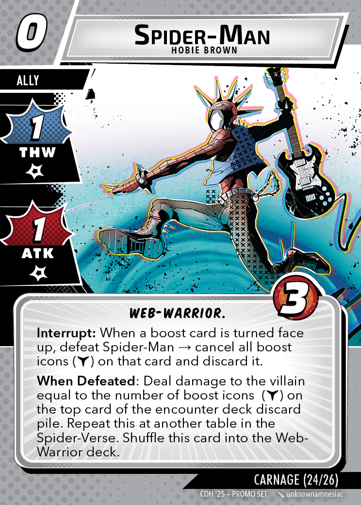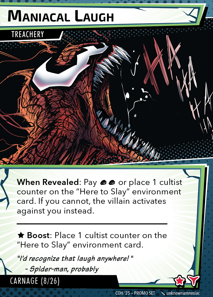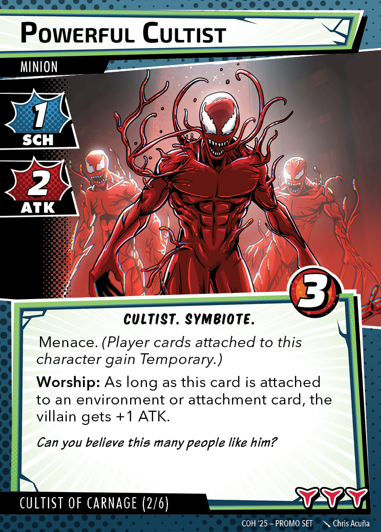 The Con of Heroes 2025 Campaign consists of any four scenarios of your choosing. The first three use double-sided symbiote cards as both challenges and rewards. Randomly select a symbiote upgrade for the first three scenarios, and gain the flipped benefit side as a reward for defeating them.