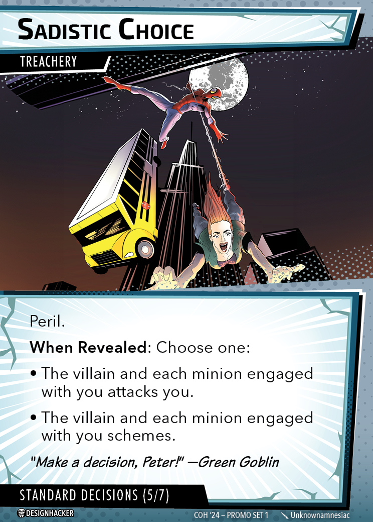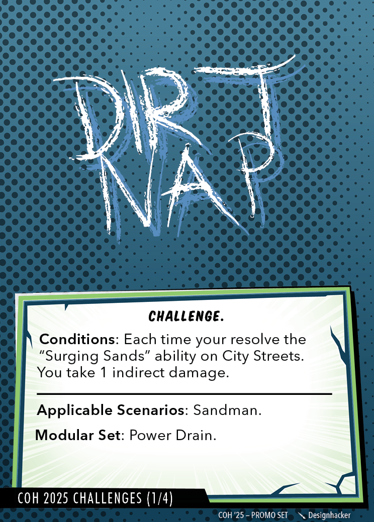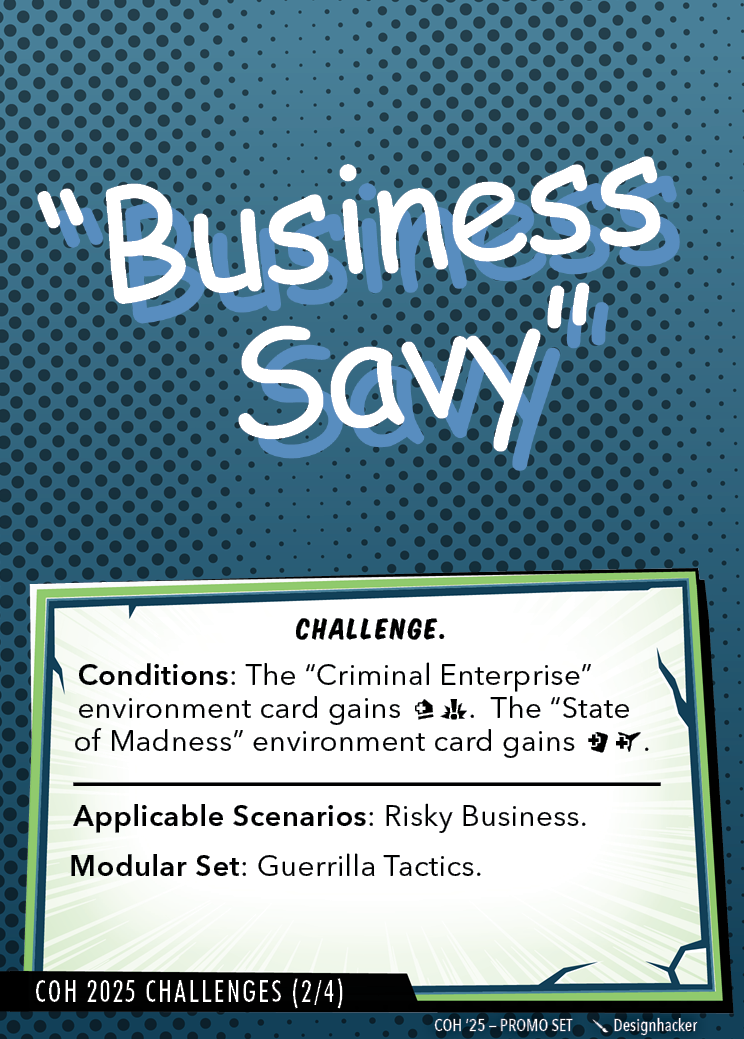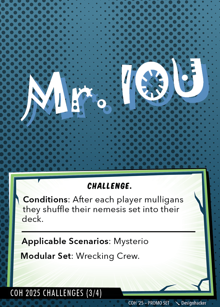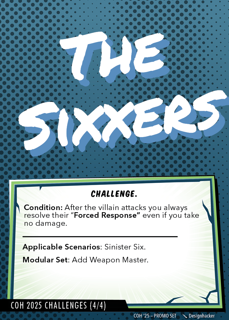 These challenge cards can be used to spice up four scenarios (Sandman, Risky Business, Mysterio, and Sinister Six).