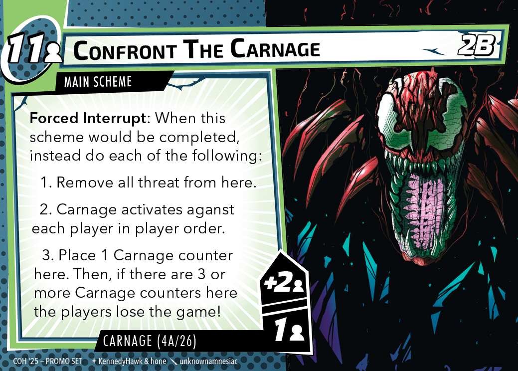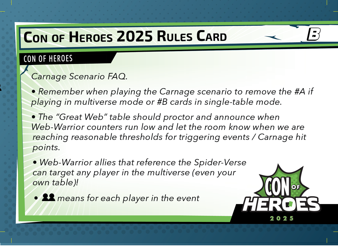 Carnage can be played with one table (A set cards), or multiple tables in multiverse format (B set cards). Rules for the scenario can be found in the rules card below.